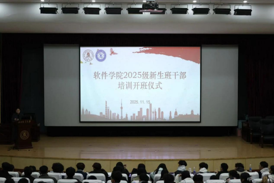 为进一步加强学生干部队伍建设,提升新生班干部的综合素质与履职能力,11月15日,软件学院于书林堂成功举办2025级新生班干部培训会。本次培训由学生工作管理科科长常娜主持,学院党委副书记靳海波、学生工作管理科副科长张书华、2025级辅导员郝丽英、刘金璋出席,优秀学生干部代表张龙、贺瑞瑞受邀参加,2025级全体新生班干部参加培训。