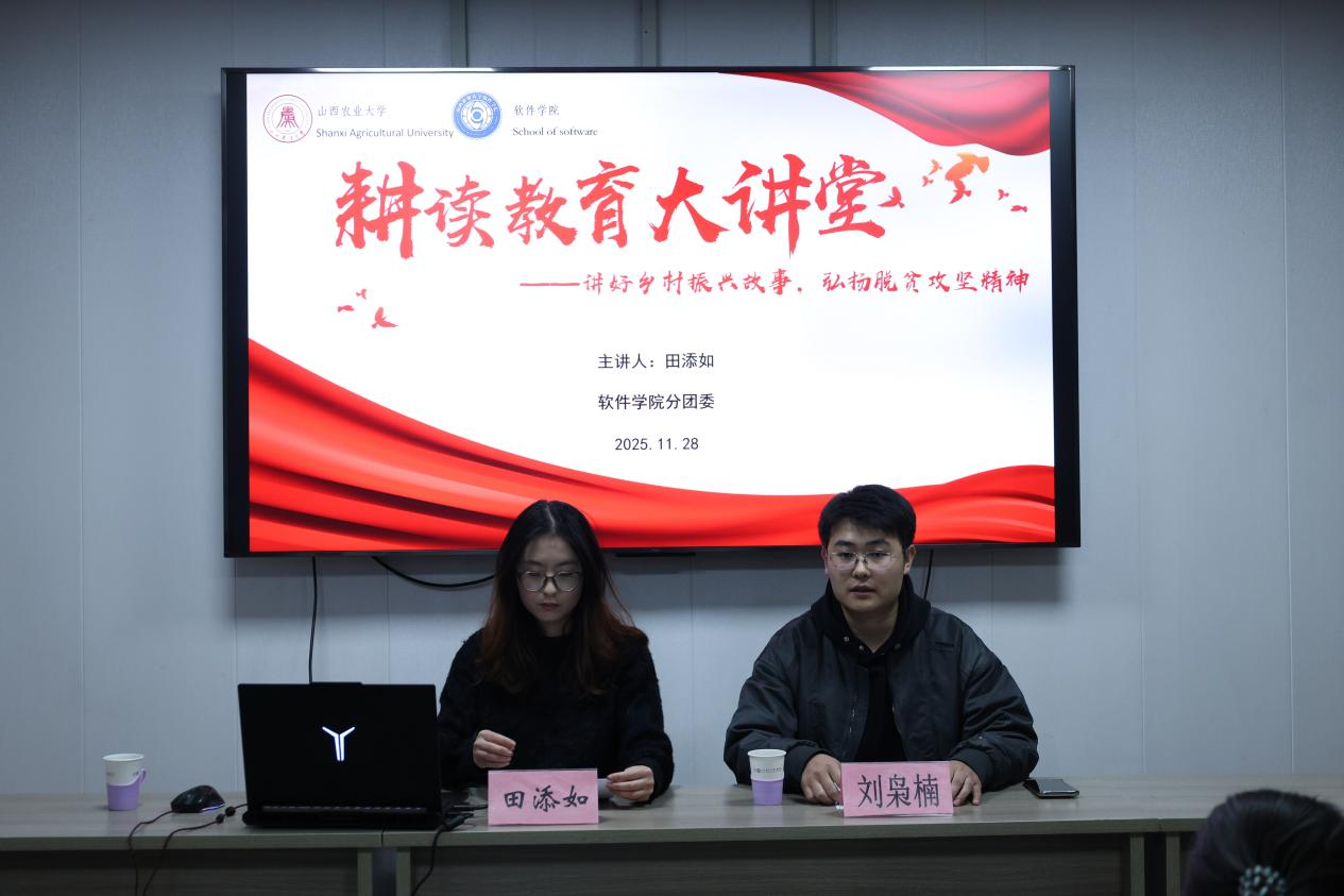 为引导新生立足时代使命规划成长路径,明晰青年价值实现的多元化途径,近日,软件学院于崇学楼一层会议室组织开展耕读教育大讲堂。本次活动特邀学院2022届优秀毕业生、现任介休市连福镇人民政府工作人员的田添如担任主讲,2024级辅导员刘枭楠主持活动,部分2025级学生参加。
